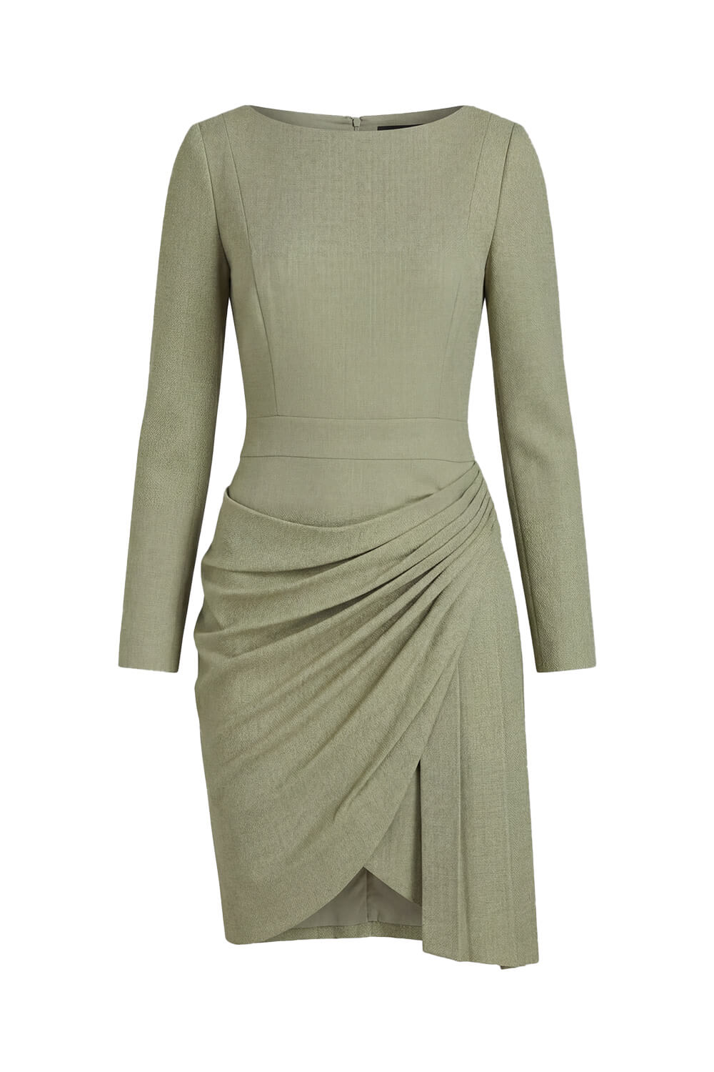- Silhouette : Long-sleeve sheath mini dress with wide boat neckline and clean, fitted bodice.