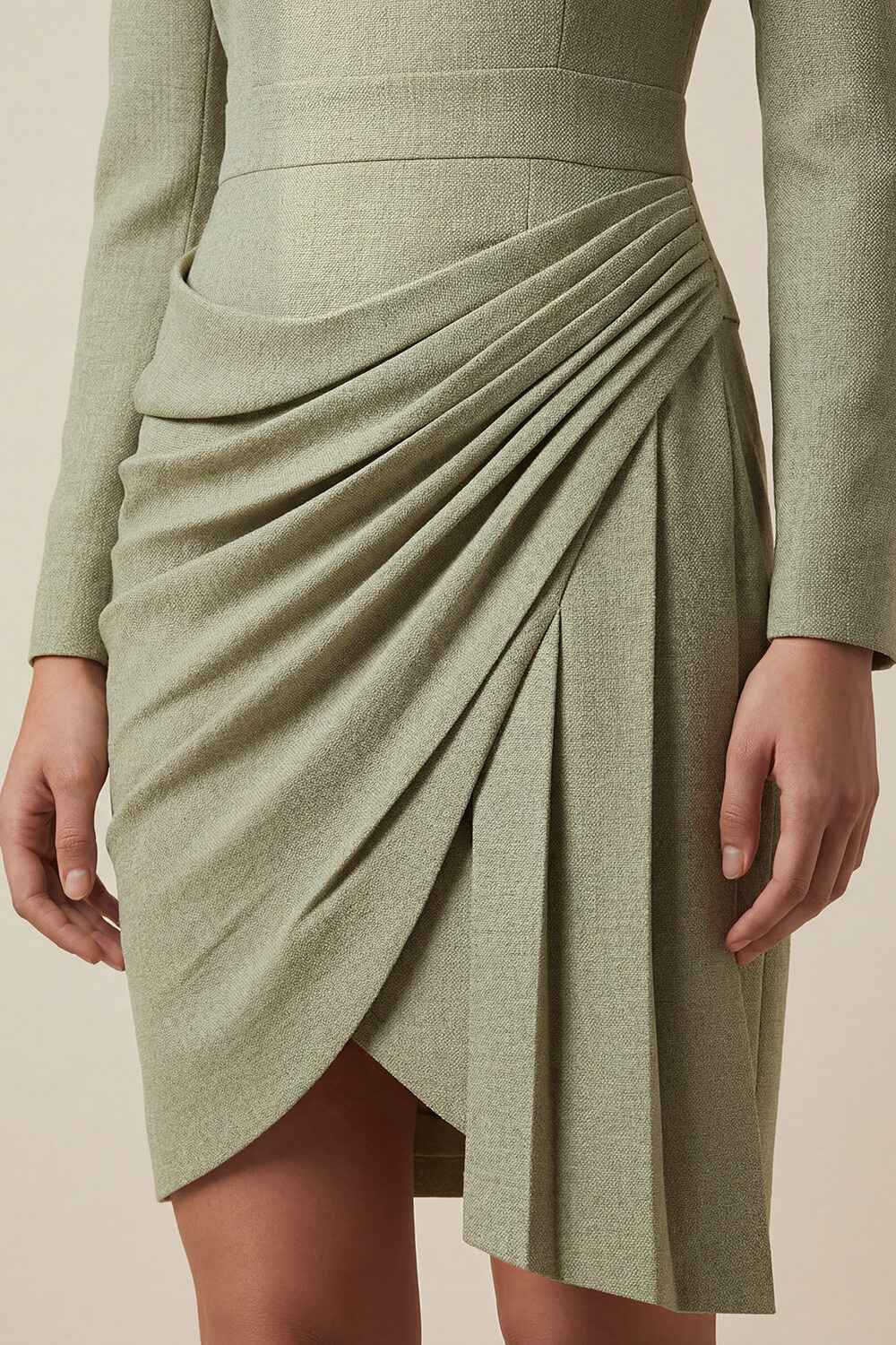 - Skirt: Asymmetric draped wrap skirt overlay gathered with soft pleats at the right hip; angled wrap hem with extended side panel.