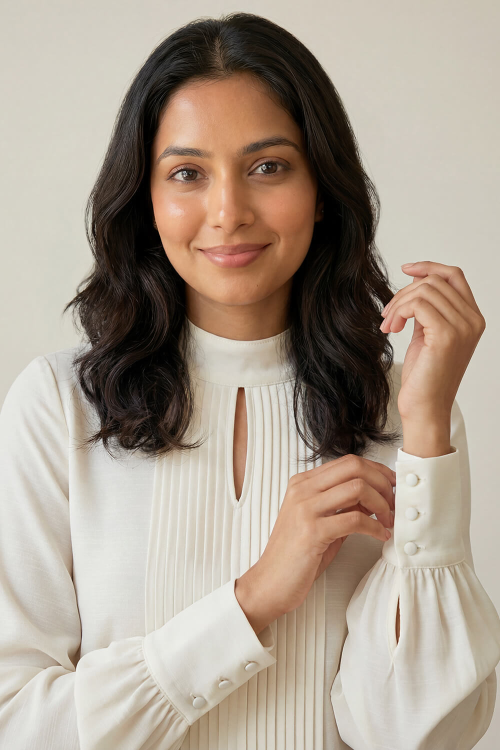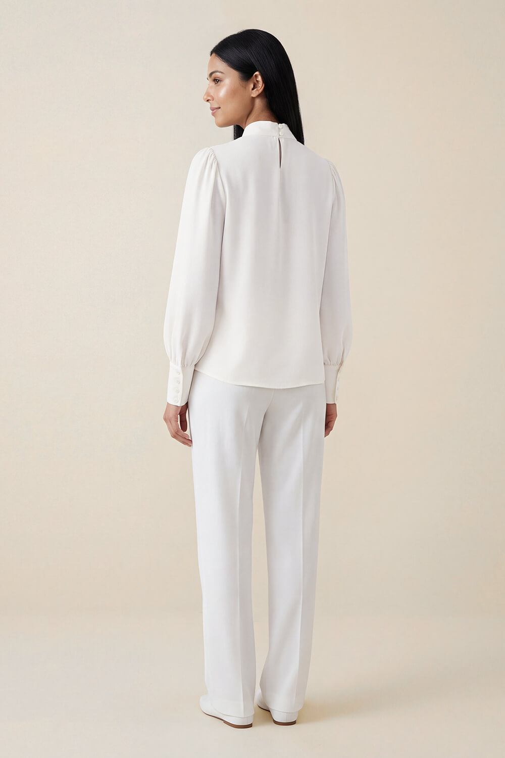 - Sleeves : Long sleeves with volume gathered into wide cuffs with button closure