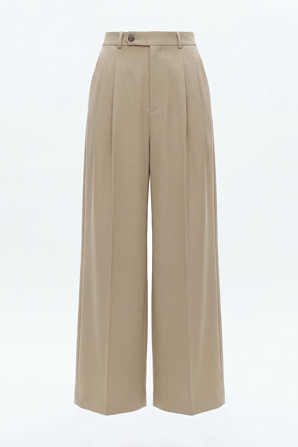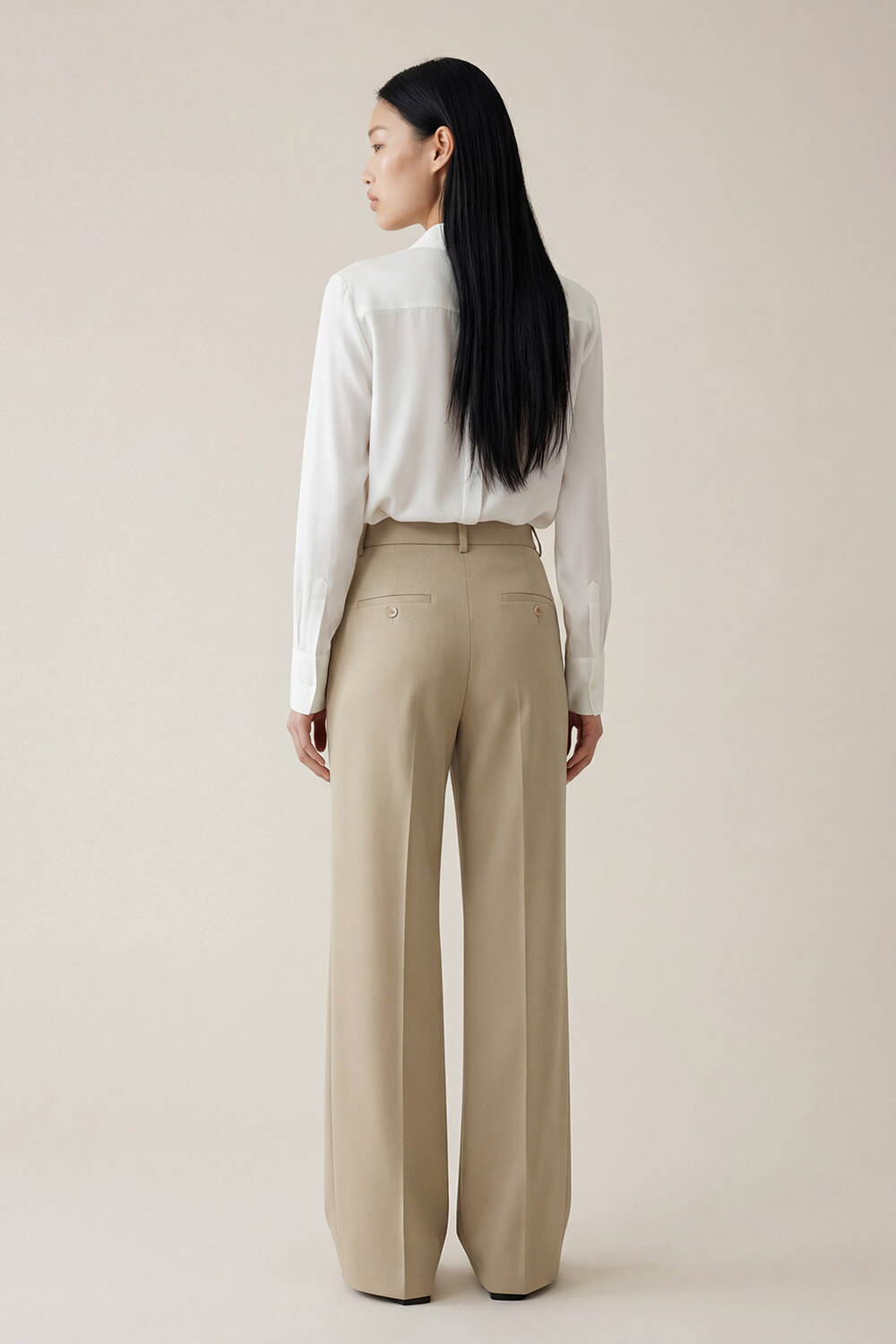 - Silhouette : High-rise waistband with belt loops, 1-button closure with zip fly.