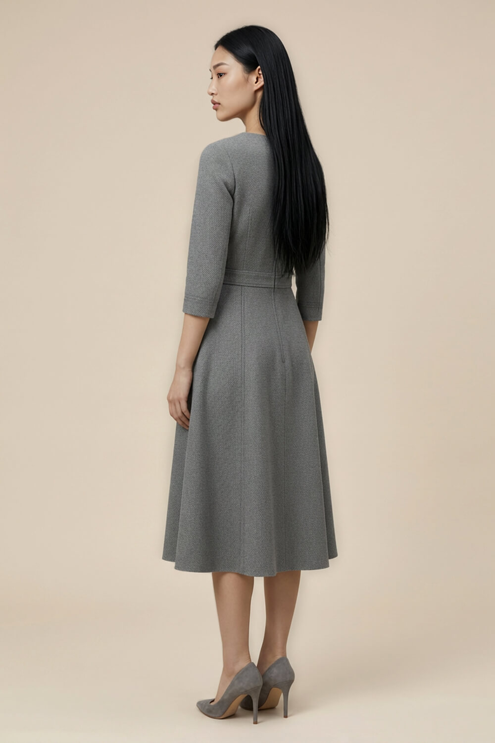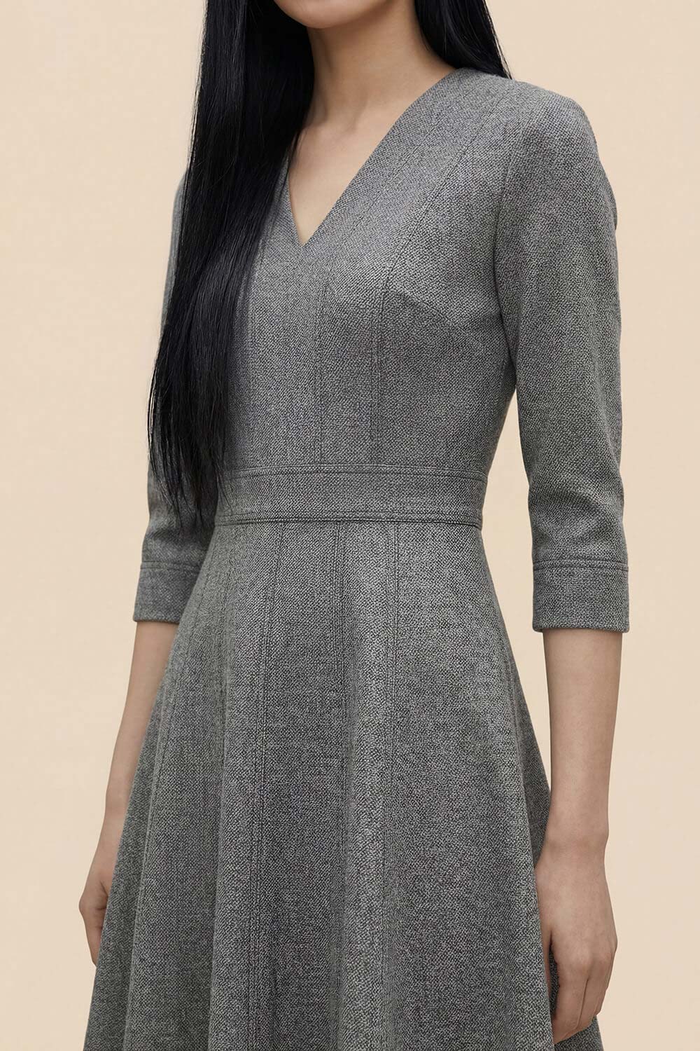 • Silhouette: Panelled seamed A line midi dress with V neckline